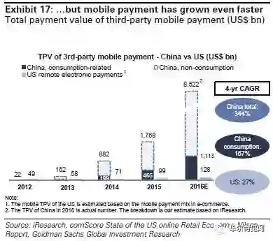 2016年中国移动支付体量已达到美国同行规模的70倍,而其中消费相关的支付规模亦达美国同行规模的8倍。