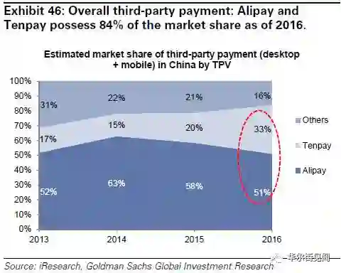 支付宝(51%)和财付通(33%)两家2016年已经占据中国第三方支付市场份额的84%