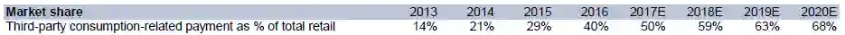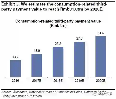 尤其是在第三方支付领域,高盛预计,消费相关的第三方支付市场规模将在2020年达到31.6万亿人民币(截止2016年数据为13万亿人民币,下图),扩张近2.5倍,年均复合增长率24%。