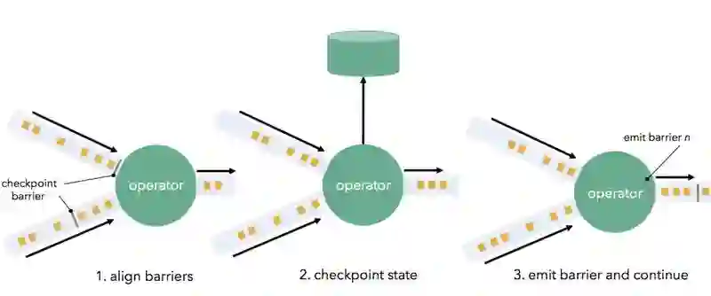 这类似于微批处理方法,其中两个检查点之间的所有计算都作为一个整体原子地成功或失败。 然而,这个就是两者唯一的类似点。 Chandy Lamport 算法的一个重要特点是我们永远不必按流处理中的“暂停”按钮,用来等待检查点完成后安排下一次 Batch 数据处理。 相反,常规数据处理始终保持运行,而状态持久化仅在后台发生。 以下引用原始论文,