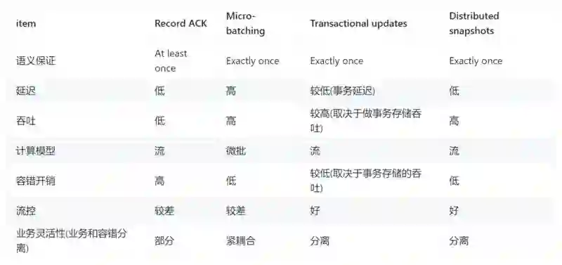 我们遗漏了一个共同特征,即失败后的快速恢复,不是因为它不重要,而是因为(1)所有讨论的系统都是基于完全并行的分布式处理系统,恢复是基础能力;以及(2)在有状态的应用程序中,状态恢复的瓶颈通常在于存储而非计算框架。