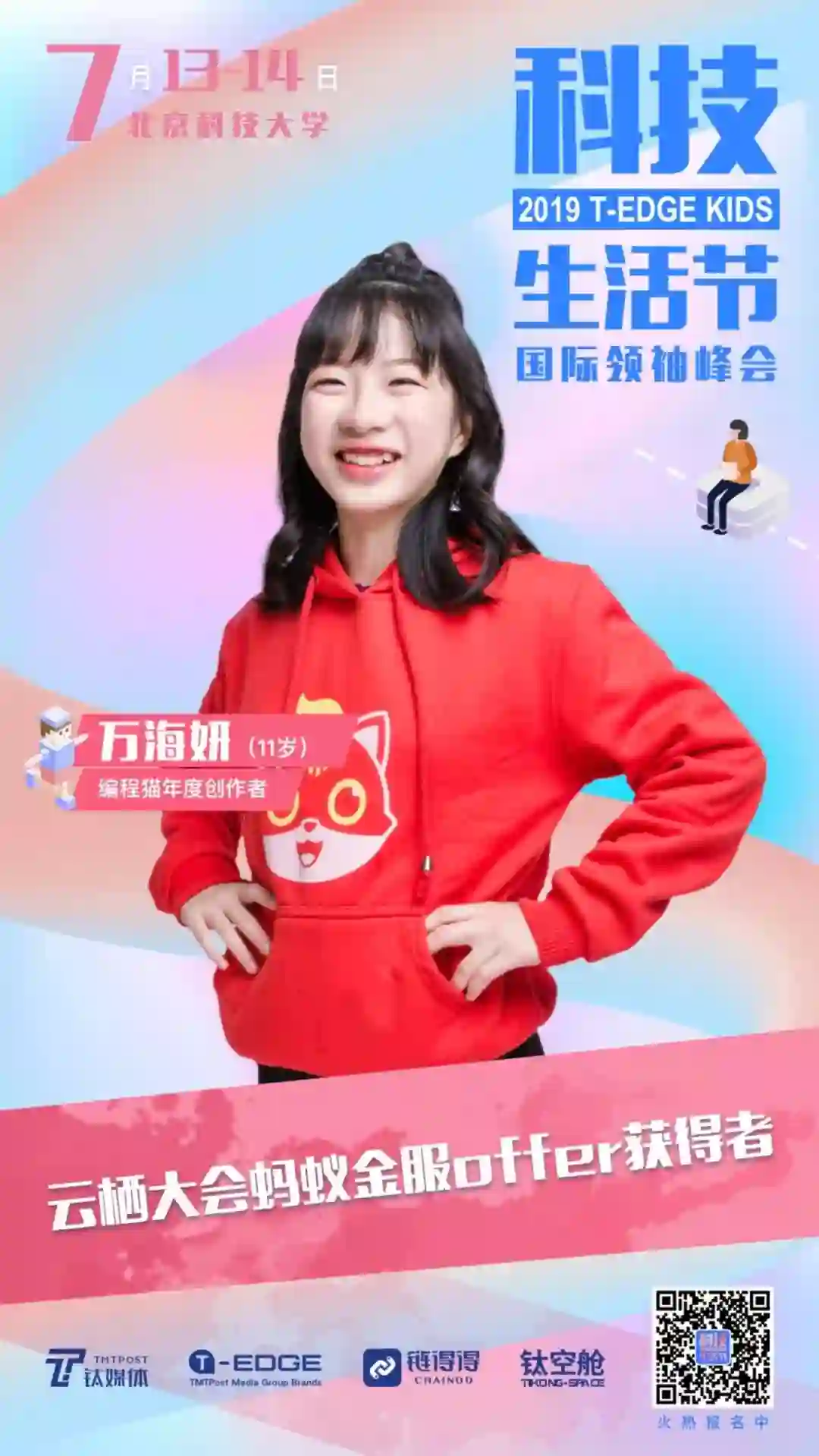来自上海的11岁少女万海妍,曾是支付宝云栖大会年龄最小的参赛者,却凭借自己的出色表现引起蚂蚁金服董事长井贤栋的注意,一举拿下蚂蚁金服的offer。