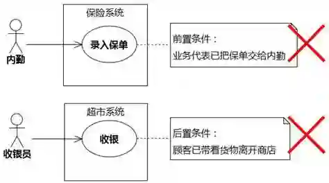 图6-3中“录入保单”用例的前置条件是错误的。业务代表是否已经把保单交给内勤,系统无法检测,不能作为前置条件;同样,“收银”用例的后置条件也是不对的。顾客是否已经带着货物离开商店,系统也无法检测,不能作为后置条件。