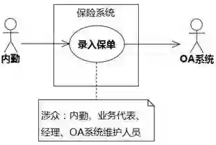 执行者使用系统做某个用例,产生的后果会影响到其他人。受影响的这些人也是涉众。还是以“内勤→录入保单”为例,如果系统做得不好,没有检测内勤录保单时是否填了必填项就放了过去,后面负责审核的经理工作量增加了。