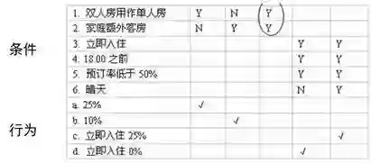 如果用文字说明业务规则比较困难,可以使用一些辅助的手段,例如决策表、决策树。图6-23就是一张决策表,描述了宾馆打折的规则。
