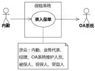 用例的执行者如果是人类,当然是用例的涉众。执行者如果不是人类,就不是涉众,因为它没有利益主张。针对图6-11中保险系统的“内勤→录入保单”用例,内勤是人类,是涉众,而OA系统不是人类,不是涉众。
