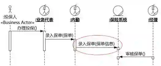 说到这里,也许您已经看出来,业务建模对于识别涉众非常有帮助。如果我们在需求之前做了业务建模,会更了解一件事情的前因后果,大多数涉众都能够从业务序列图中看出来。例如,从图6-15的业务序列图中,业务对象内勤、业务代表、经理和投保人很容易看出来。另外,消息参数“保单信息”提醒建模人员还会涉及被保人和受益人。这样,图6-14中所列举的“内勤→录入保单”的涉众就找齐了。