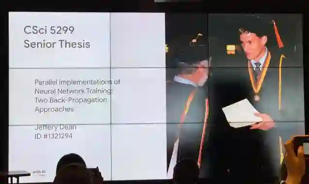 在活动现场,Jeff Dean 展示了他 1990 年的本科毕业论文。在其中他研究了神经网络训练反向传播的并行化可能性——只有更大的规模的计算才能让机器学习成功。但在当时因为计算机的算力有限,Jeff Dean 的研究显得有些过于超前,现在,并行化的训练方式已经被大量机器学习算法所采用了。