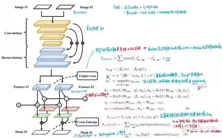 V1版本采用CNN+RCNN得到原图尺寸(resize成ResNet可接受大小320\*240)中每个像素点为keypoint的概率,以及每个像素点的描述子向量(256\*1)