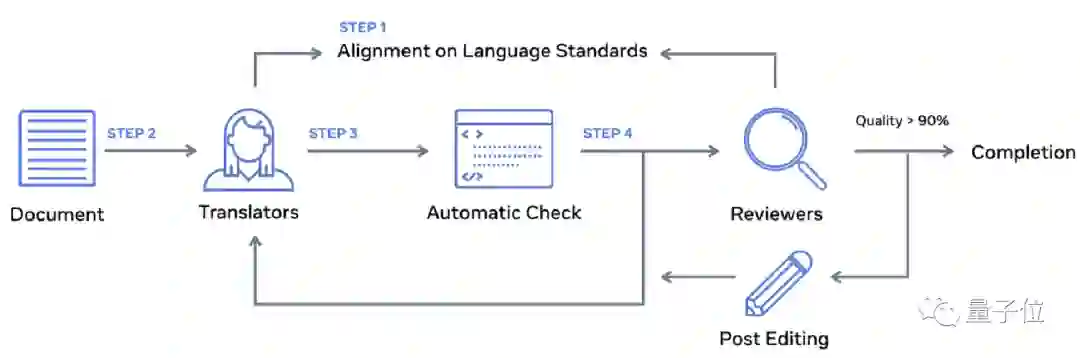 首先,译员们翻译Flores-200的全部句子,并检查;然后,独立审查员小组开始审查翻译质量,根据他们的评估将一些译文送去进行后期编辑。