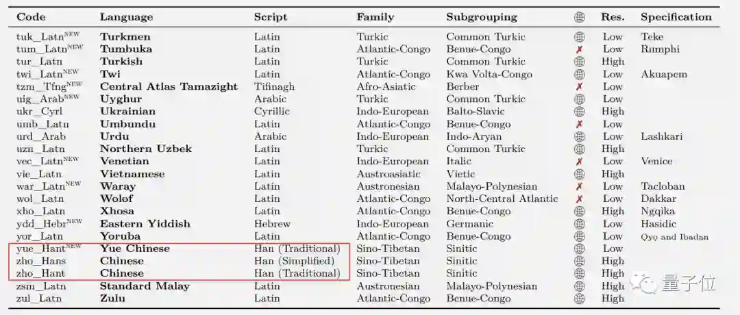 其二,是对200种语言建模:研究者开发了一个语言识别系统LID(language identification systems),标记出某段文字是用哪种语言写的。