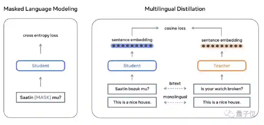为了对小众语言进行较好的建模,研究者开发了一种“学生-教师挖掘法” (Student-Teacher Mining)该方法的内容是:让一个大规模的多语言句子编码器的教师模型,与几个语料少的学生模型相互学习整合。
