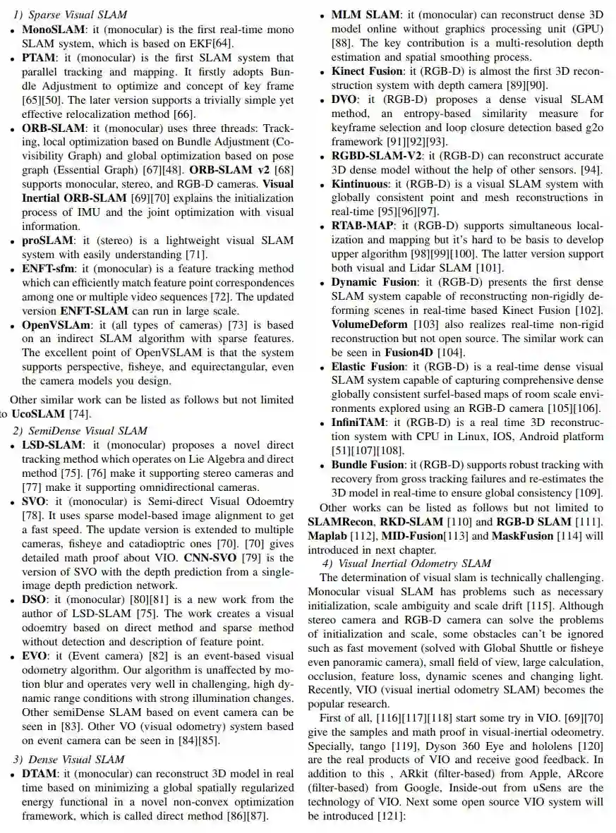 2.视觉slam涉及视觉传感器的原理介绍,产品选型,开源视觉slam系统和视觉惯性系统的介绍,比较,分类。而后介绍了深度学习在视觉slam中的应用,以及视觉slam的挑战和未来。