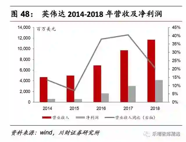 从2014年至2018年英伟达营业收入不断增长,从47亿美元增长至117亿美元。公司净利润由2014年的6.31亿美元增长至2018年41.41亿美元,CAGR高达60%。