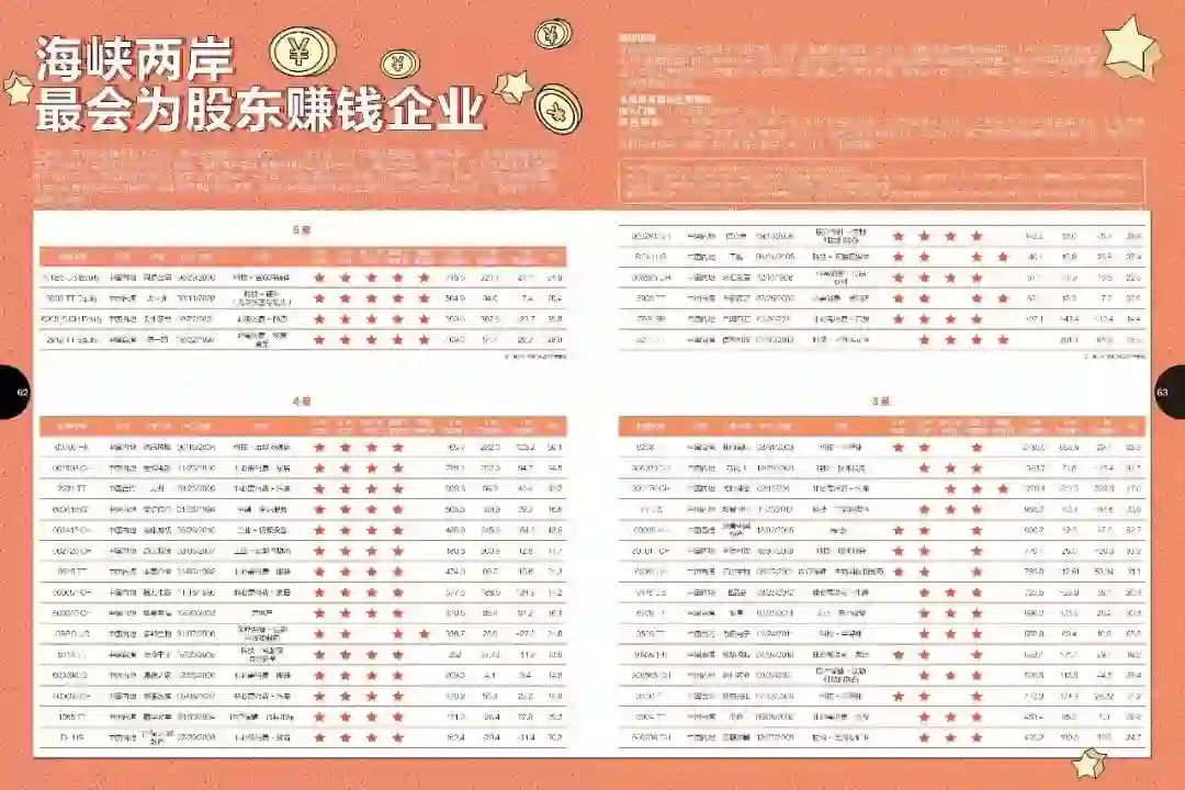 《商业周刊/中文版》首次推出“海峡两岸最会为股东赚钱的企业排行榜”。检视总部设在中国内地、中国香港、中国澳门、中国台湾等地,在全球上巿一共8000多家企业之中,哪些公司最会为股东赚钱?最基本的筛选门槛是负债比,必须≤50%。然后,再从符合资格的企业中,依据5年、3年、与2017年前三季的平均ROE,排出前100大的名单,每通过一项检验就给一颗星。另外两项指标则是,企业必须连续3年获利、以及每股现金流排名前100名。经交叉比对后,必须获得三颗星(含)以上的公司才能入榜,共有73家,进榜率不到1%。