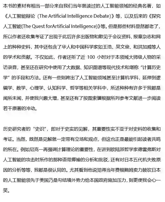 《简史》所列引用长达14页近400部专著、论文,对于以此作为想要深入了解扩展阅读的读者,亦极有裨益,同样适合业内人士了解人工智能那些鲜为人知的历史和掌故,作为深入学习的指导。