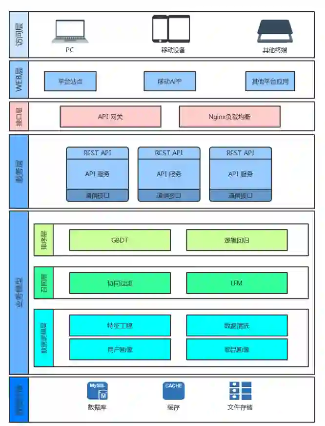 上面是企业中一个常见的推荐系统的架构图,一般来讲,一个完整的推荐系统企业级的架构应该包括数据的存储、业务模型、服务层以及上层对于用户来讲可见的 App 或者一些其他可视化是产品。