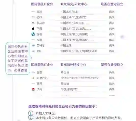 很多内地的科技公司在印度、新加坡等地都建立了研发中心,唯独没有在香港落地 (见下图), 希望香港政府能与科技园积极探讨,如何能吸引这些公司落地香港并能留下来、发展好。