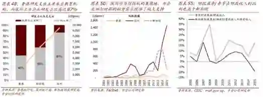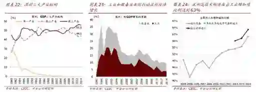 在临近香港的深圳,农业跟香港一样也逐渐息微,其占比亦下降到近乎零。在发展高科技的领域深圳理应跟香港同步,然而深圳的工业占比达44%。更重要的是深圳高技术制造业占到工业增长值的比例超过60%。在深圳的经济结构中,工业和服务业共同拉动深圳的经济发展。