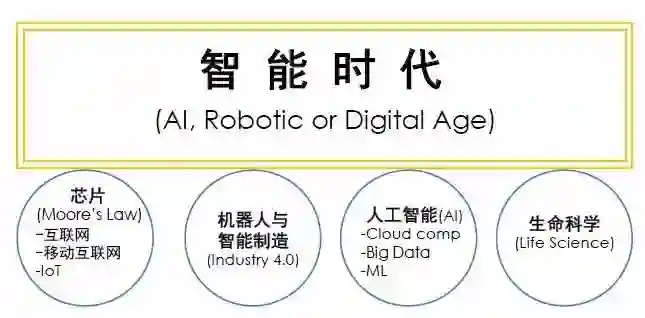 智能时代下有几方面的技术几乎可以同时聚焦起来。第一,按照摩尔定律发展的芯片、传感器、硬件技术的突破。每五年提高十倍。第二,机器人与智能制造,使得制造效率大大得到提升。第三,人工智能的云计算、大数据、机器学习。第四,生命科学数字化。这四大智能产业将带着我们往前走,并产生各种各样的可能性。