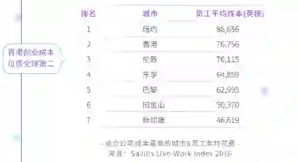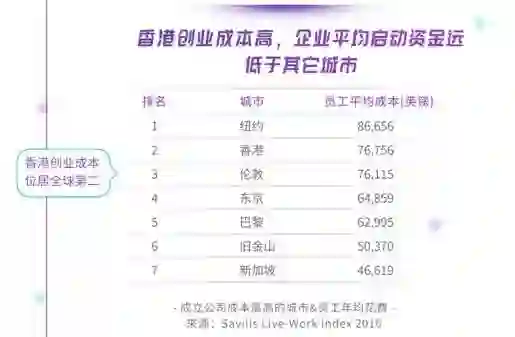 高昂房价导致的居于全球第二的创业成本(仅次于纽约,如上图);其次是政府制定的一些旨在帮助初创企业,但由于手续烦琐和操作不到位,不能落实或效果不佳的政策,如 ITF 给初创企业的科技资助项目、移民局的专才和优才引进政策。很多初创公司因为手续太麻烦而不愿去申请,最后去了深圳或内地其他城市,这不得不说是香港和初创企业的损失。