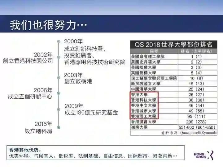 过去二十年,香港在科创上也付出过不少努力。从董建华时代建立创新及科技基金到科技园、数码港的成立,从2009年成立180亿港元的研究基金,到2015年正式设立的创科局,香港一直重视科技创新并为之不断投入。香港创科局一直不为余力推动香港创科事业发展。