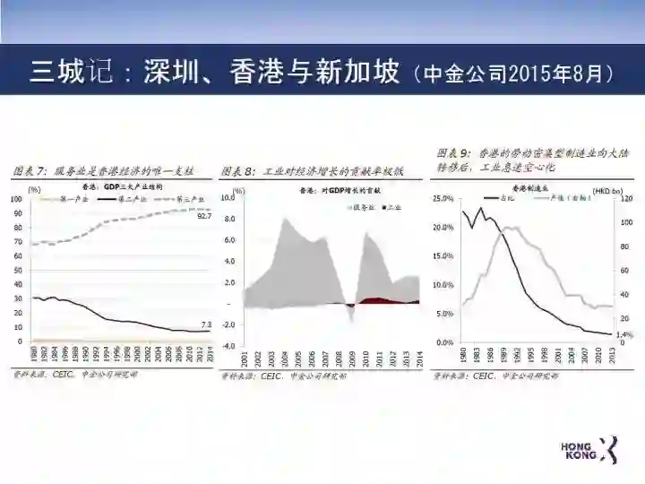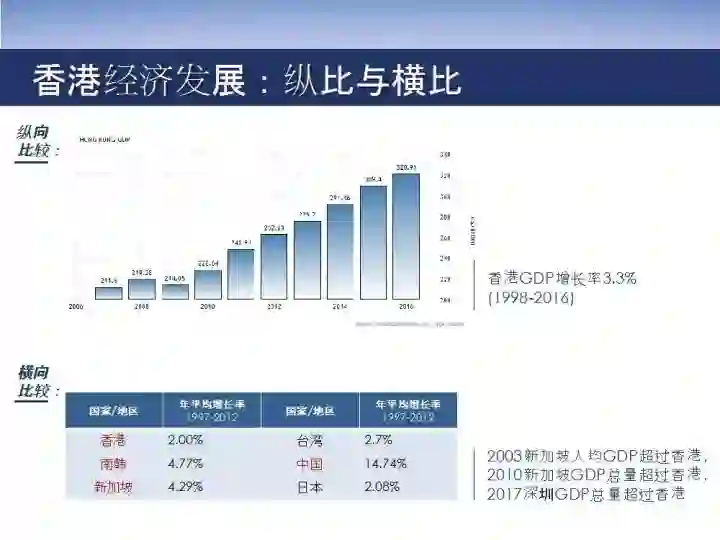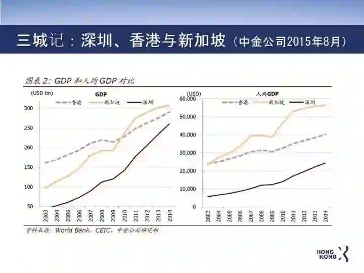 中金公司在2015年发表了一个名为 《三城记》的调研报告:对香港、新加坡、深圳,做了一个非常详细的对比。报告显示,香港的主要竞争对手新加坡的经济活力一直高于香港。2003年新加坡的人均GDP超过香港,2010年新加坡的GDP总量超过香港。深圳是香港的邻居,更是未来的合作伙伴,今年GDP总量也超过香港的总量。