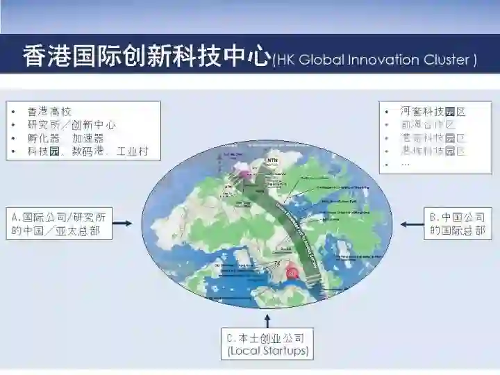 这里面由几个部分组成,地理空间包括各个高校、研究所、孵化器、科技园、数码港、工业村等香港的物理场景。再拓展出去跟深圳隔壁的河套、前海、东莞、珠海等,通过大桥、高铁等大型基建的建设,创新科技中心就随着一小时生活圈拓展开来了。