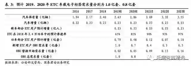 按照交通部规划,2019年年底车载电子标签装有量达到1.8亿辆,ETC市场规模将于2019年爆发。