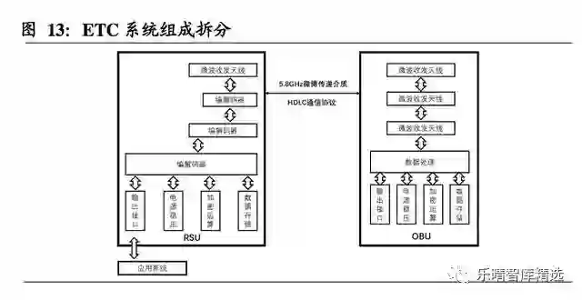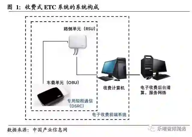 ETC主要由车载电子标签(OBU)、路侧单元(RSU)和专用短程通信技术(DSRC)三部分构成。
