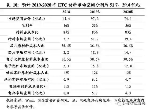 根据聚利科技2018年车载电子标签原材料占比成本比例为83.2%,我们取原材料占成本比为83%,得到2018-2020年ETC材料市场空间分别为7.7亿元、51.7亿元、39.4亿元。