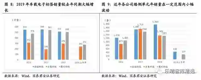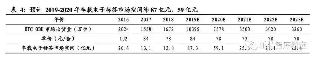因此,预计2019-2020年车载电子标签市场空间分别为87.3亿元、59.1亿元。ETC抢装期过后,车载电子标签预计每年仍有20余亿元市场空间。