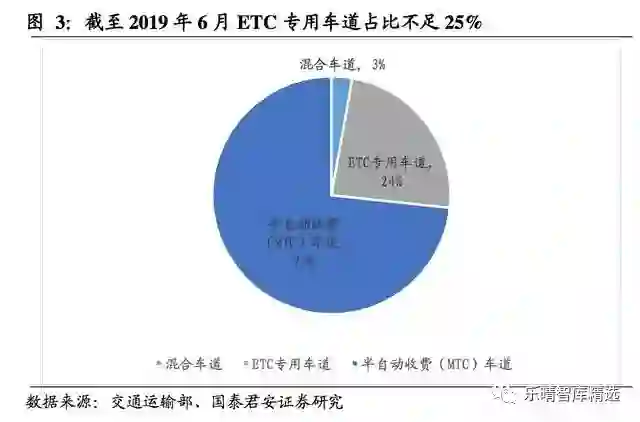 截至2019年6月底,全国29个联网省份(除海南、西藏外)共有的9464个收费站中,ETC专用车道有2.08万条,人工收费车道(MTC车道)有6.29万条,混合车道有0.2万条,其中ETC专用车道占全车道的不足25%。粗略估计约有6万条车道在未来需要改造成ETC专用车道。