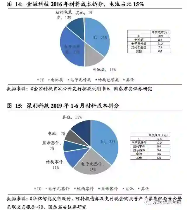 根据《金溢科技招股说明书》与《华铭智能:发行股份、可转换债券及支付现金购买资产并募集配套资金暨关联交易报告书》,IC占成本比例最大,大约占原材料成本的36-37%,其次是电子元器件占比25-36%(聚利科技中是包括电子元器件和显示器件)、结构零件占比11%-13%和电池7-15%。