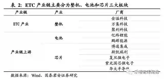 ETC的产业链上游产业包括集成电路、电子元器件、电池、塑胶、五金压铸件等部分。