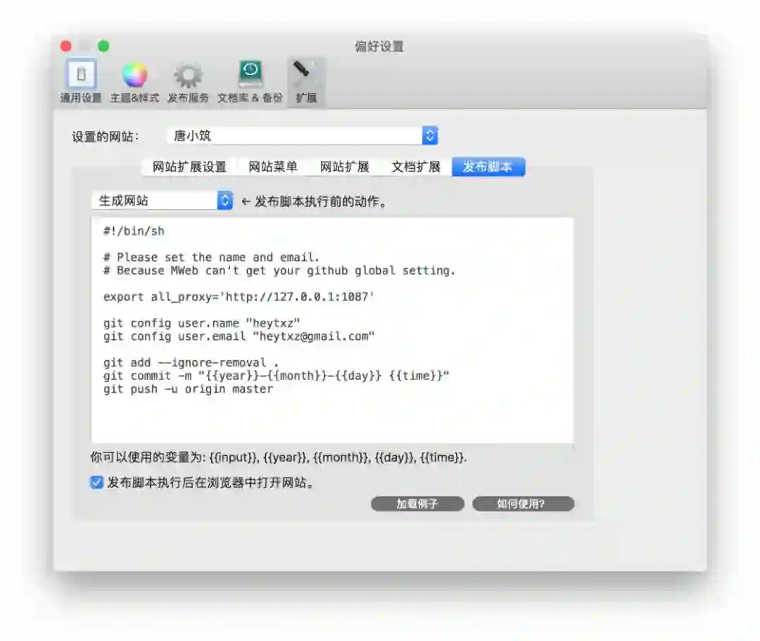 MWeb 自带数种网站主题,如果要托管到 GitHub 或 Coding,在已配置好 git 的条件下,一分钟内即可生成和发布静态博客,文章图片资源也会托管在 GitHub 等平台,无需使用七牛等作为图床。如果需要,MWeb 也支持 Google Photos、imgur、七牛、又拍云和自定义图床。