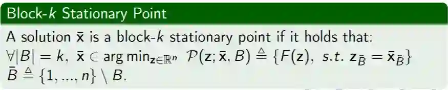 这是我们提出的块 K 稳定点的概念。块 K 稳定点是指,当我们(全局地)最小化任意的 K 个坐标(其余的 n-K 个坐标固定不变),我们都不能使得目标函数值得到改进。