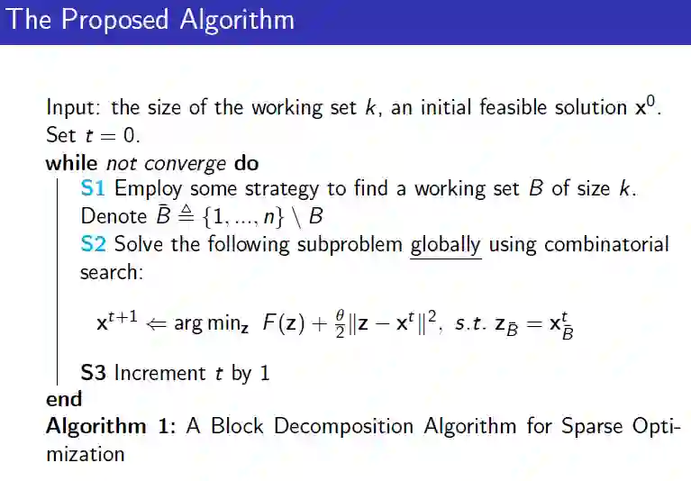 稀疏优化由于其内在的组合结构,一般比较难求解。组合搜索方法可以获得其全局最优解,但往往局限于小规模的优化问题;坐标下降方法速度快,但往往陷入于一个较差的局部次优解中。