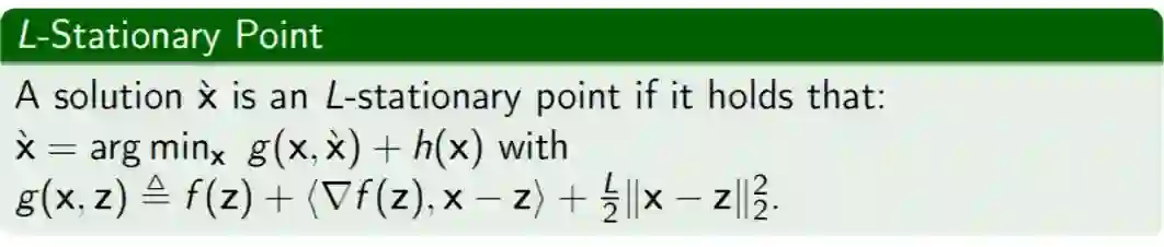 李普希茨稳定点是通过一个临近算子来刻画,经典的临近梯度法得到的是李普希茨稳定点。临近梯度法每一步需要求解一个临近算子,该算子有快速封闭解,但是这种简单的上界替代函数方法通常导致算法精度不高。