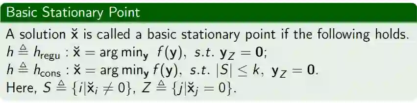 基本稳定点就是指,当非零元指标集已知时,解达到全局最优。这类稳定点的一个很好的性质是:稳定点是可枚举的,这使得我们能够验证某个解是否是该问题的全局最优解。
