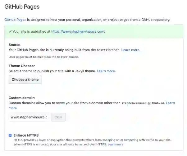 GitHub Pages可以让你指定自定义域名。对于我的网站来说,所有访问http://stephenvinouze.github.io/的都会被重定向到https://www.stephenvinouze.com/。