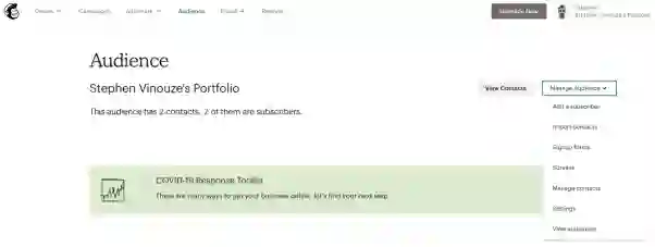 除了SEO之外,你还可以邀请访问者继续关注未来的文章。有几种机制可以达到这一点。一种方法叫做Mailchimp(https://us18.admin.mailchimp.com/)。就像Disqus一样,你可以嵌入一个HTML表单,这样你在发布新文章的时候可以通知用户。许多主题已经包含了Mailchimp。很方便吧?