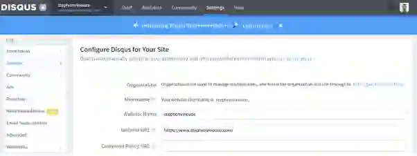 下面的截图中可以看到我的网站Disqus配置。在我的_config.yml文件中,我将Disqus值设置为stephenvinouze: