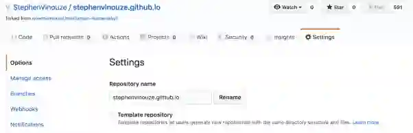 分叉之后,你需要将这个仓库的名字改成your_username.github.io。点击“Settings”,然后重命名仓库: