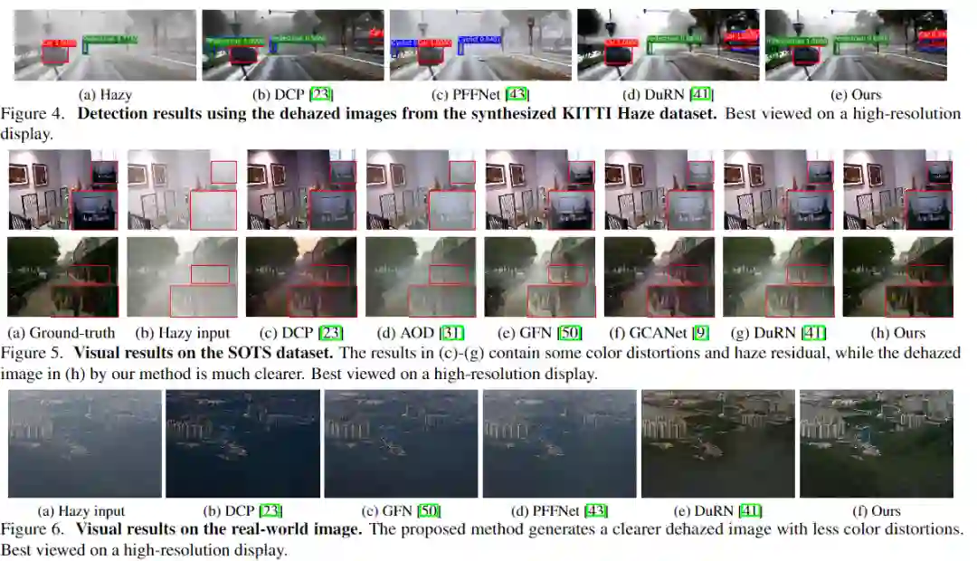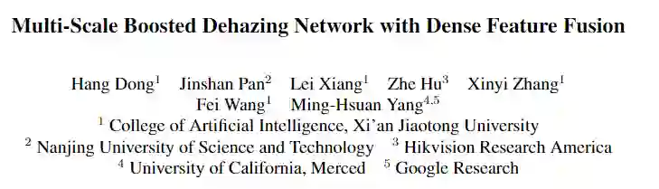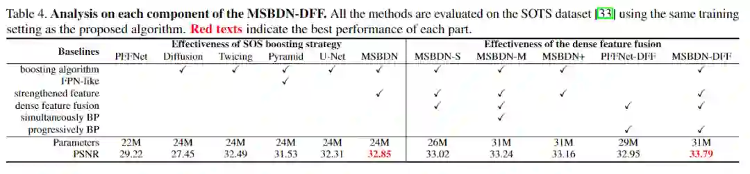 本文首先证明了boosting策略也将促进图像去雾任务。考虑到这两个原理,本文提出了一种基于U-Net架构的具有密集特征融合(DFF)的多尺度增强去雾网络(MS-BDN)。将网络的解码器中引入图像恢复模块,具体的,在解码器中并入了“Strengthen-Operate-Subtract”(SOS)增强策略,以逐步恢复无雾图像。由于U-Net的编码器中存在下采样操作,可能无法从U-Net的解码器有效地检索空间信息。为了解决这个问题,本文还提出了一种基于反投影技术的DFF模块,以有效融合不同层次的特征,并证明了该模块可以同时保留高分辨率特征的空间信息,并利用非相邻特征进行图像去雾。大量实验评估表明,所提出的算法与最新的除雾方法相比具有出色的性能。
