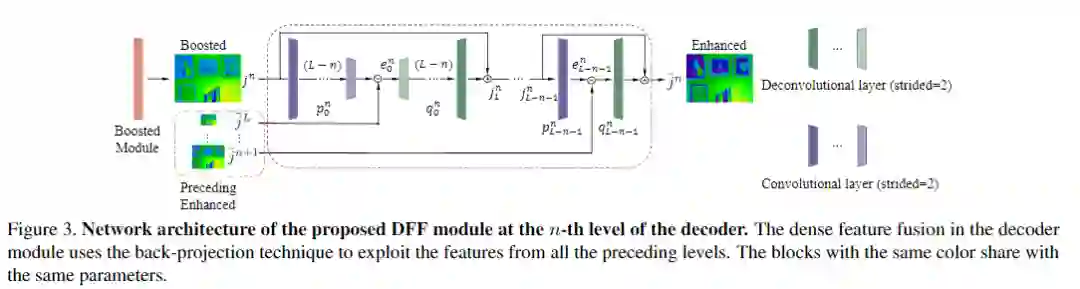 基于式(9)中的反投影算法,本文提出了一种DFF(Dense Feature Fusion Module)模块,用于有效地纠正丢失的信息并利用非相邻级别的特征。提出的DFF旨在通过错误反馈机制进一步增强当前层级的特征,并在编码器和解码器中使用。如图1所示,在每个层级引入了两个DFF模块,一个在编码器中的残差组之前,另一个在解码器中的SOS增强模块之后。编码器/解码器中增强的DFF输出直接连接到编码器/解码器中的所有剩下的DFF模块,以进行特征融合。