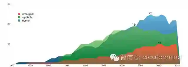 图 3 1973 至 2016 年间,活跃的符号式(symbolic)、层创式(emergent)和混合式(hybrid)架构的可视化。在图上显示了同时活跃的项目的最大数量。