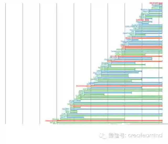 图 2 此次调查的 86 种认知架构的时间表。每条线对应一个认知架构。认知架构按照开始日期排序,因此最老的认知架构在图的最下部。由于只明确知道几个项目的开始和结束日期,因此我们按照项目网页的发布和活动日期还原了时间表。颜色对应于不同类型的架构:symbolic(符号式,绿色),emergent(层创式,红色)和 hybrid(混合式,蓝色)。