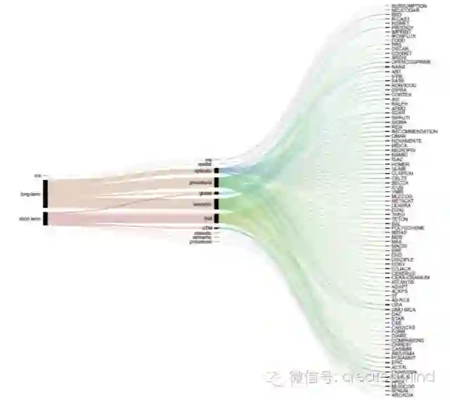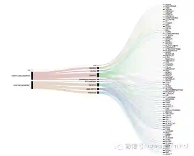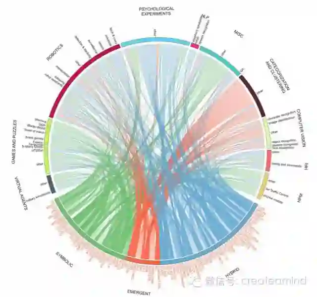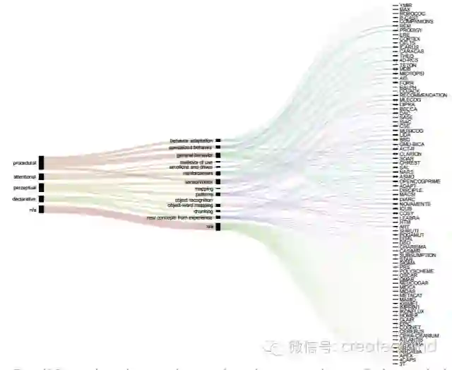 正如我们早些时候提到的,给已经实现的认知架构创建一个广泛的和有组织的编目的第一步是 [1]。这个概述包含了 26 个项目的扩展描述,其中包含的信息有:简要概述、主要元素的原理图、共同组分和特征(记忆类型、注意、意识等)、学习和认知发展、认知建模和应用、扩展性和局限性。这一类的调查将一些不相交的社区的研究者聚集到了一起,并帮助建立了这些不同方法和他们所使用的术语之间的映射。但是,这种描述性的和表格式的格式让我们无法对这些架构轻松地进行比较。因为我们的架构样本很大,所以我们实验了可做替代的可视化策略,例如冲积图(alluvial diagram)和圆图(circular diagram),它们常常被用于组织复杂的表格数据。这些图的交互式版本让我们可以探索这些数据和查看相关索引。