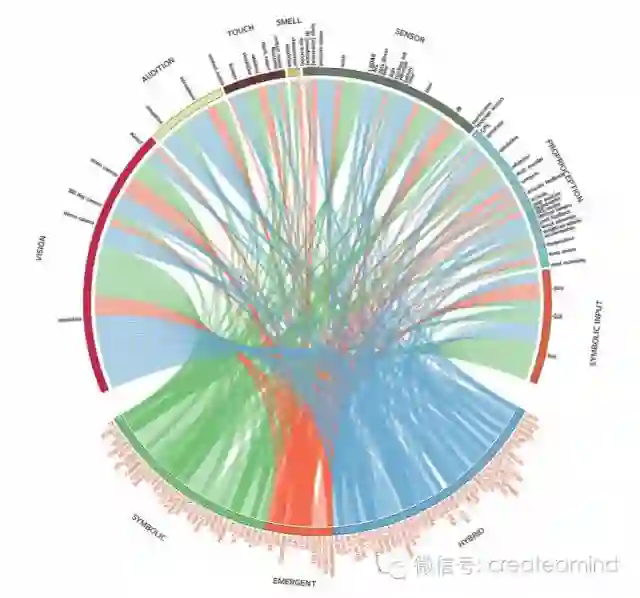 图 7 显示了认知架构的感知通道(sensory modalities)。该架构分成三组: 符号式(绿色),层创式(红色)和混合式(蓝色),位于图底端。图中其他部分对应不同的感知通道,包括视觉、听觉、触觉、嗅觉和本体感觉。这个感知分类还包含了不对应任何人类感官的多种感知。「符号输入」类别表示的是认知架构中的输入只限于文本形式,或者需要通过 GUI。这不包括文本输入模拟音频、视觉或其他类型的信息。图中每个大类别扇形中的带表示的是这些感知通道的子类别(例如视觉类别下包括 Kinect、单眼相机、模拟等)。感知通道与架构之间的条形是用来表示它们之间的连接。如果一个架构控制多个感官,条形就越不透明。每个认知架构的感知方式列表都带有相关文献,被包括在补充材料和图形的互动版本中。